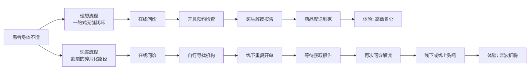 这不仅造成了资源的“灯下黑”,更形成一种难以打破的虹吸循环:人才不断向中心汇聚,而患者为寻求可靠诊疗只能向上集中,加剧了大医院的拥堵与基层的能力不足,还常因“医检诊药”流程割裂,不得不在多个场景间辗转,就医体验被切割成碎片。