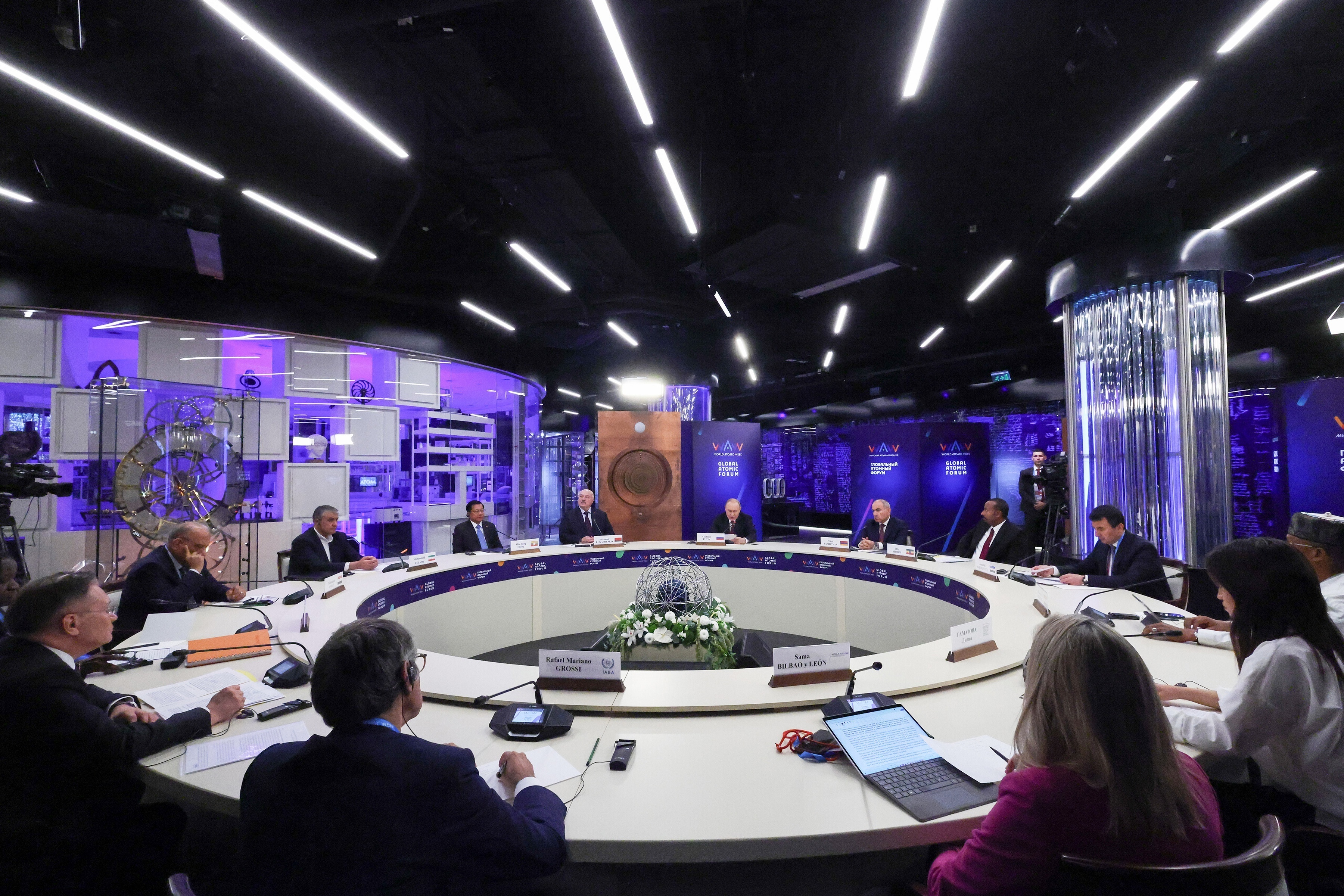俄罗斯总统 Vladimir Putin 主持世界原子能周论坛,莫斯科。9月25日,俄国家原子能集团主办的首届「世界原子能周论坛」在莫斯科举行,本次论坛主题为「从新技术范式到新世界观」,共有来自100个国家的超过1万名代表参加,其中包括俄罗斯总统、白俄罗斯总统、缅甸代总统、亚美尼亚总理、埃塞尔比亚总理及国际原子能机构总干事。俄总统 Putin 指出「核能已被视为环保能源技术」,俄罗斯已开始通过核电站满足数据中心的电力需求,并将很快启动海上浮动式核电站的批量生产,预计2030年推出世界上首个闭式燃料循环核电系统,从根本上解决铀资源枯竭问题。摄影师:Evgenia Novozhenina