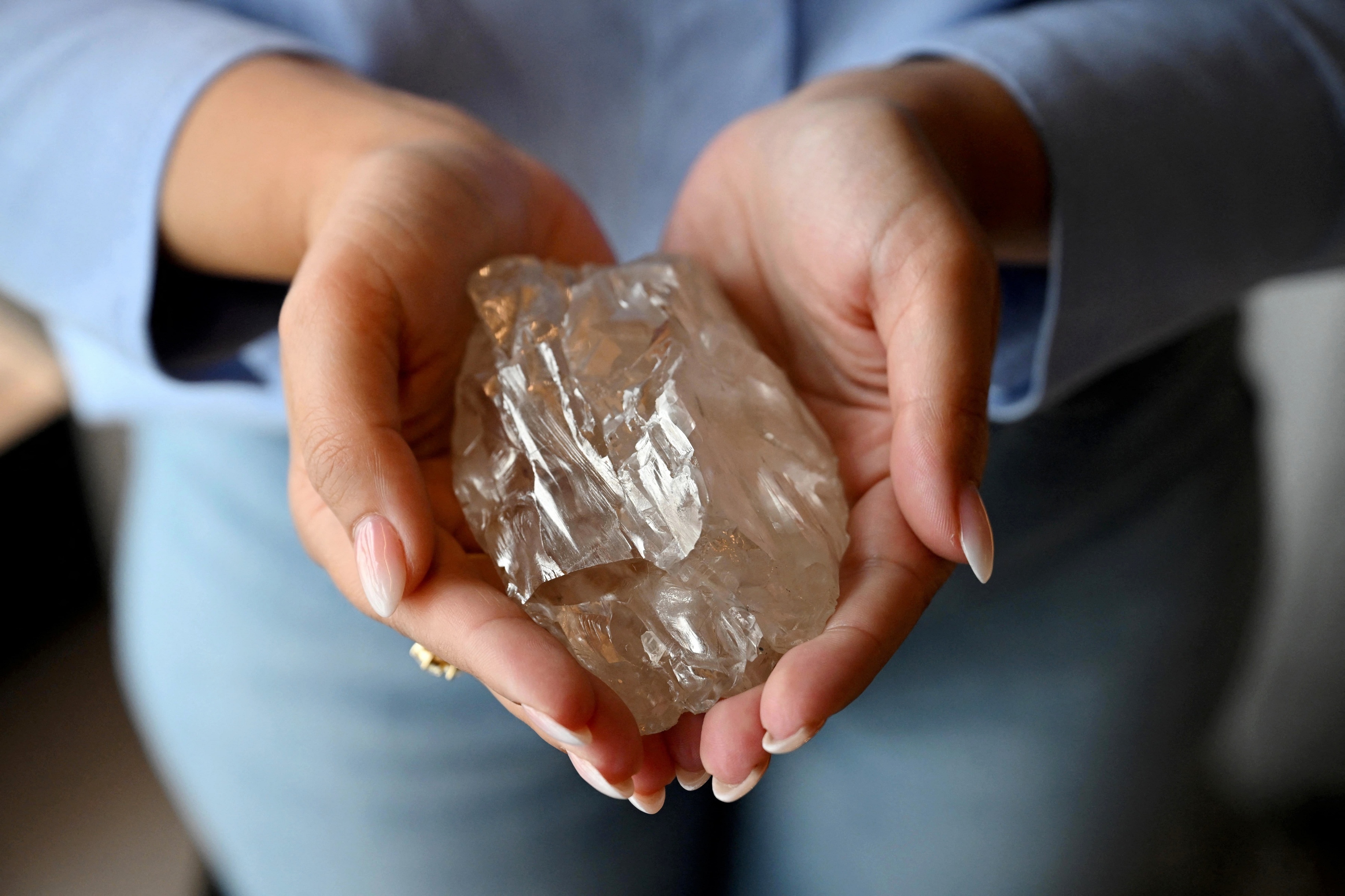 比利时钻石抛光商 HB Antwerp 展示世界第二大宝石级钻石原石「Motswedi」,安特卫普。这颗钻石原石于2024年8月开采自博茨瓦纳东北部的卡罗韦矿区,重量达到2488.32克拉,尺寸为106.3×71.6x53.8mm,经鉴定为罕见的 Type IIa 型钻石,具有出色的净度和白度,名字在茨瓦纳语中意为「泉水」。钻石开采商估计这颗原石的售价可能达到4000万美元,目前已有3家国际级博物馆有意向购入收藏。摄影师:Nicolas Tucat