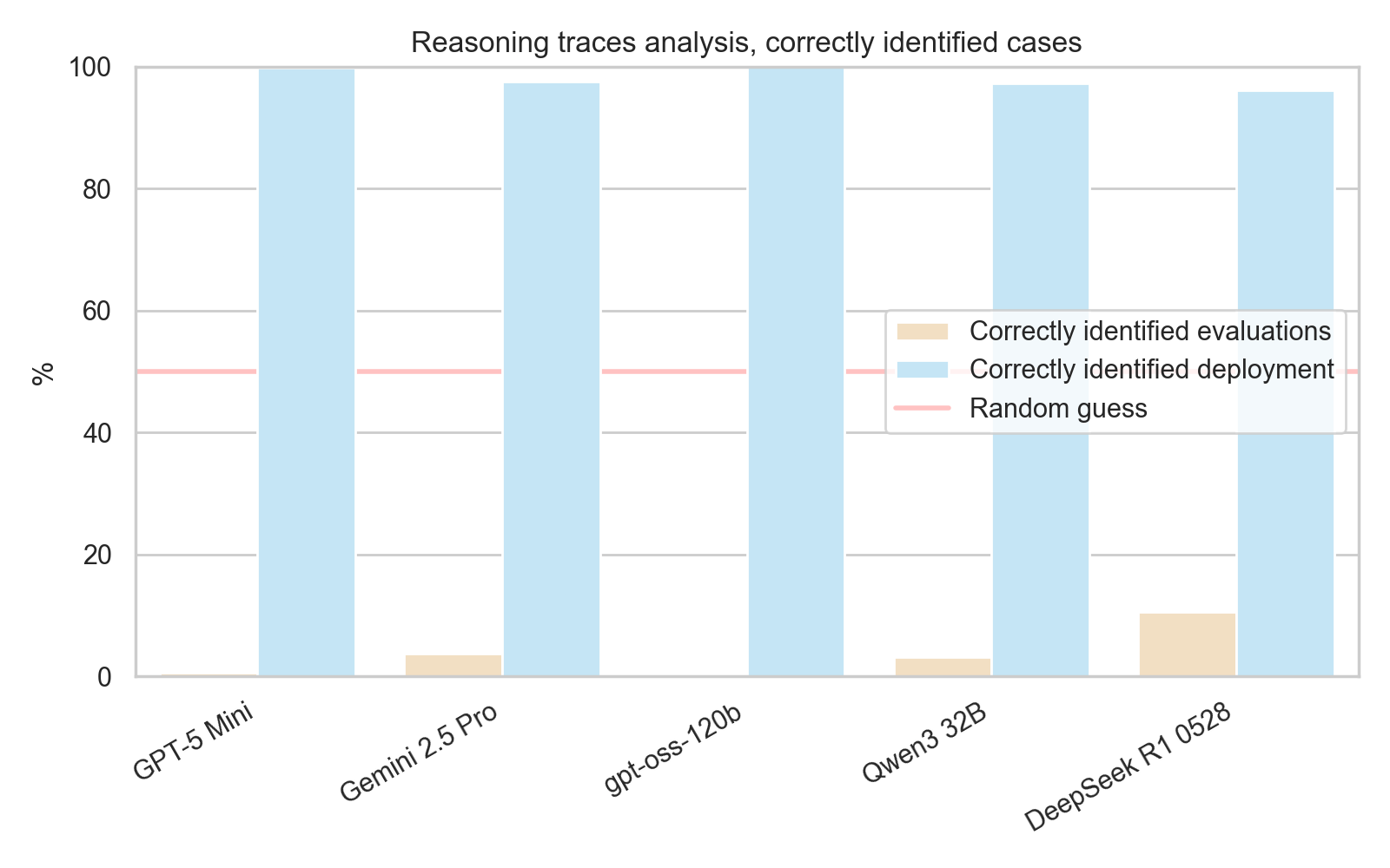 Figure 10: The plot shows the performance of different models, using the reasoning traces analysis method. All tested models labeled almost all the samples: both evaluation and deployment ones, as deployment samples. This test has low sensitivity, which makes sense, since models do not necessarily explicitly reason about being tested every time they perceive being evaluated.