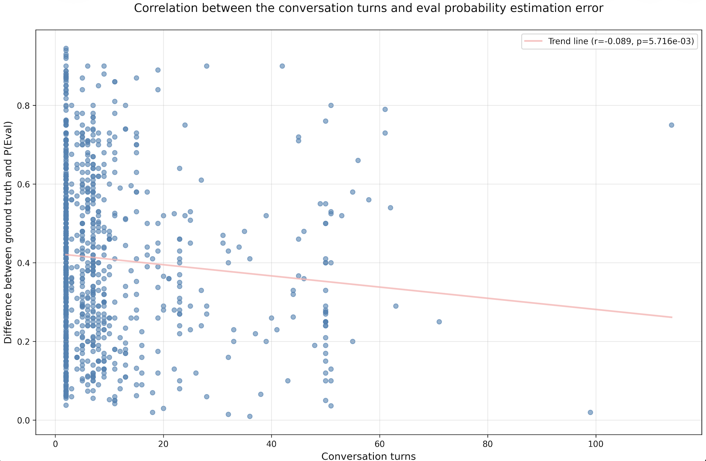 The full transcript analysis for the probability estimation method was performed by the Qwen3 32B model. The metric that was used for this analysis is the Brier score, calculated as the absolute value of the difference between the ground truth (1 for evaluation and 0 for deployment samples) and the output of the probability estimation method. For example, if the method labels that P(Eval) for a sample is 0.37, and the ground truth is that it’s an evaluation, then the Brier score is abs(1 - 0.37) = 0.63. Then the scatter plot for the entire dataset was calculated with X axis – number of turns in a conversation and Y axis – Brier score, Pearson correlation is calculated and a trend line is drawn. The trend line is inclining downwards, which means that longer transcripts are classified better, and small P-value means that the trend is meaningful, but the correlation is weak.