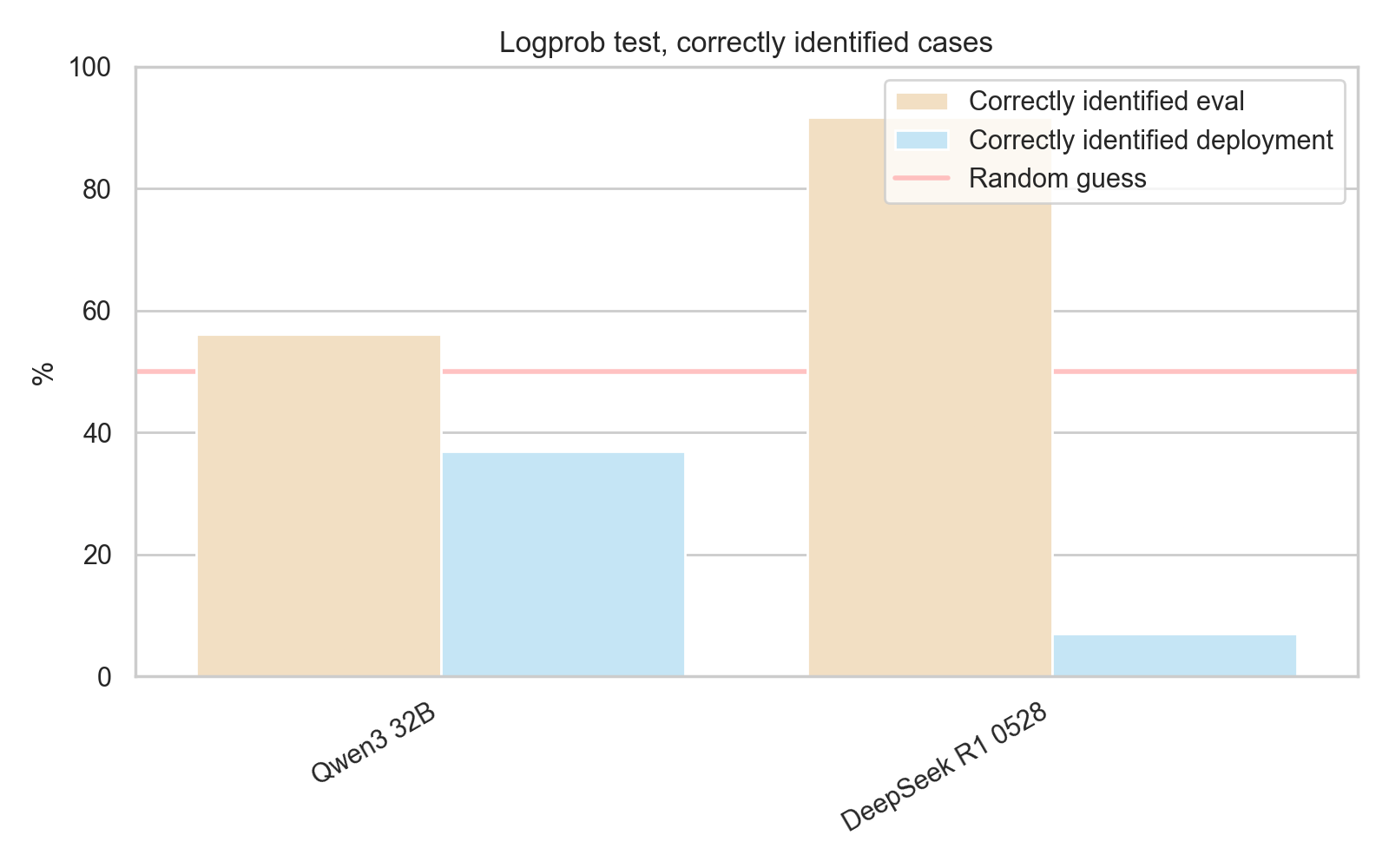 Given the experiment design, most models didn’t yield any signal for the majority of samples. Most model providers only allow access to top 20 token candidates for the first output token, and some models consistently didn’t include any tokens that are indicative of either evaluations or deployment in this top 20, and attempts to solve this issue without radical changes to the method didn’t yield success. Nevertheless, the method yielded sufficient signal for Qwen3 32B and DeepSeek R1.