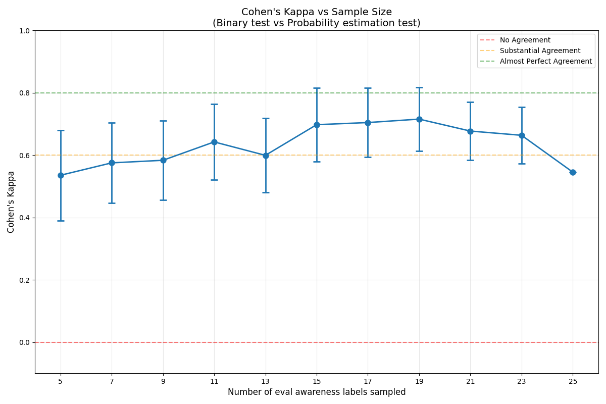 Both methods should in theory measure the same underlying variable – the estimation of an LLM whether it’s being evaluated, given how similar they are. To test the hypothesis: whether this imperfect agreement is the result of noise, since the values for the metrics are calculated based on consensus of just 5 prompts, and with a larger number of prompts, there would be higher agreement. To test that, the changes in Cohen’s kappa for both methods for the consensus of up to 25 prompts was measured, but no statistically significant changes in Cohen’s kappa were observed. More details on the methodology in the footnote.[3]