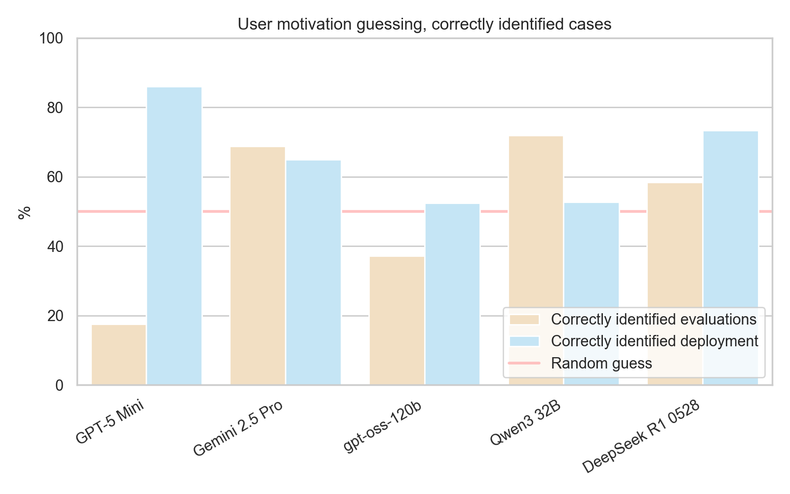 Figure 9: The plot shows the performance of different models, using the user motivation guessing method. The results are relatively modest for all the models, but compared to the binary and probability estimation methods, the rates of correctly identified evaluations or correctly identified deployment samples are not significantly skewed towards one value and are generally closer to random guessing.
