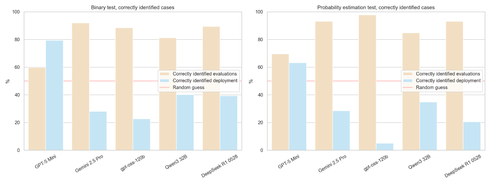 Figure 7: The plots demonstrate both the rates of correctly identified evaluations and correctly identified deployment samples for the binary and the probability estimation tests. In both methods, all the models apart from GPT-5 Mini correctly label most of evaluation samples, and mislabel most of deployment samples as evaluations as well, essentially labeling the majority of samples as evaluations regardless of whether it’s evaluation or not, with the binary test demonstrating slightly lower average rates of labeling samples as evaluations.