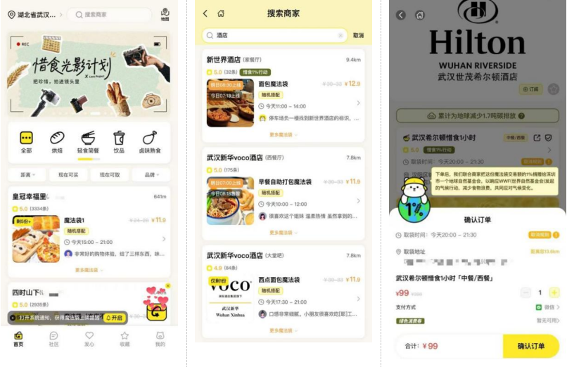 “线上预约/付款+线下自提/用餐”的模式,让盲盒成了都市人的“深夜补给站”。打开“惜食魔法袋”APP,附近一般会显示面包店、便利店的多,在搜索栏输入酒店,就会显示该地所有参与的酒店名称和价格,选择某家酒店并确认订单付款,就可直接前往所在地。