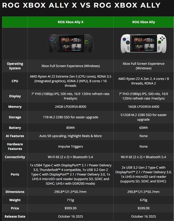2025-09-27 08:30:29 作者:柏景福微软XBOX掌机正式开售了,型号是微软与华硕联手打造的ROG Xbox Ally以及ROG Xbox Ally X,现在在北美地区开启预定,10月16号正式发售。白色Xbox Ally定价599美元,面向高端用户的黑色Xbox Ally X定价999美元,两者定价高于预期。
