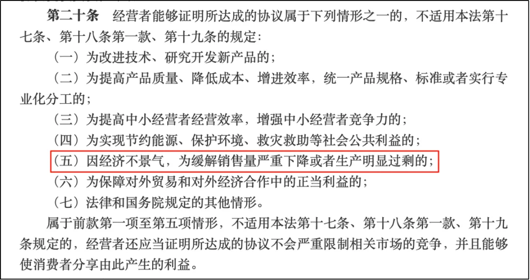 实际上,《反垄断法》第二十条第五项明确规定“因经济不景气,为缓解销售量严重下降或者生产明显过剩的”,不属于该法禁止的垄断协议。