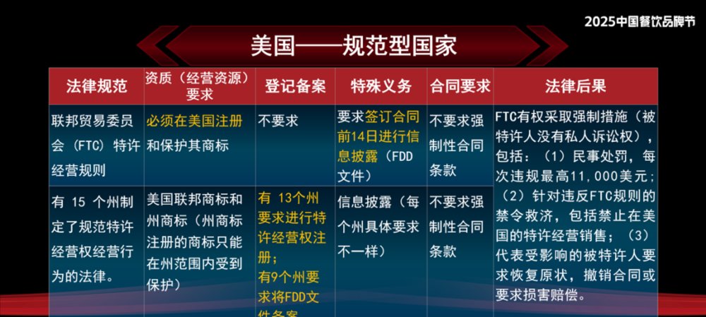 第三是特许经营规则,每个国家虽然有不同的要求,但70%的底层逻辑是一样的,因为特许经营首先是一个商业模式,而非法律概念。它最早源于美国1865年出现的商业模式,后来风靡全球。我们已经梳理了60多个国家的特许经营法律法规,发现底层逻辑几乎都借鉴了美国的特许经营规则制度。到今天为止,美国的特许经营规则仍是最严格的。
