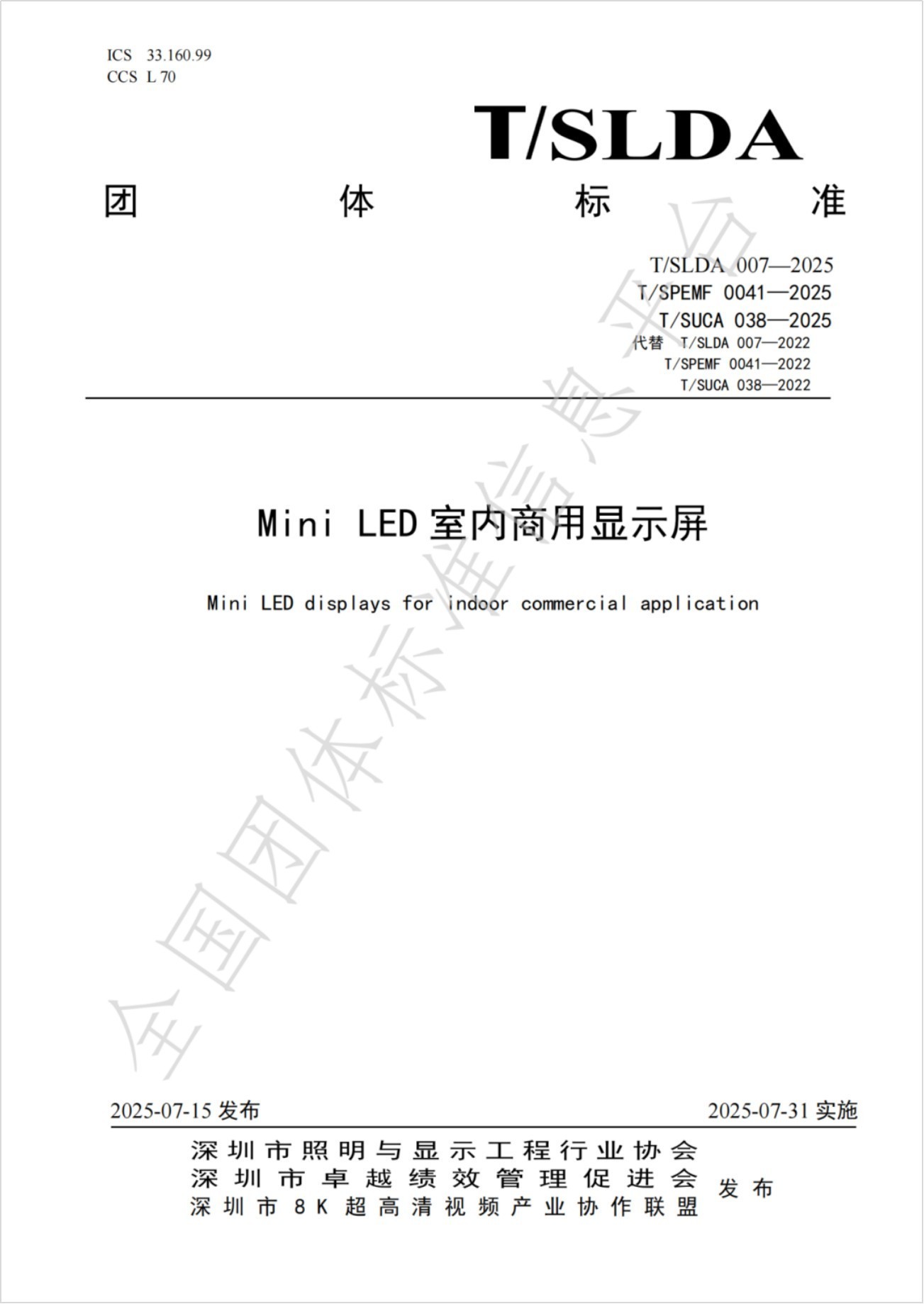 2025-09-28 10:26:39 作者:狼叫兽在全球新型显示技术加速演进、市场规模持续扩大的背景下,Mini LED室内商用显示领域迎来具有里程碑意义的重要时刻。2025年7月15日,由深圳市照明与显示工程行业协会、深圳市卓越绩效管理促进会、深圳市8K超高清视频产业协作联盟归口的《Mini LED室内商用显示屏》团体标准(T/SLDA 007-2025、T/SPEMF 0041-2025、T/SUCA 038-2025)正式发布,并于7月31日实施。
