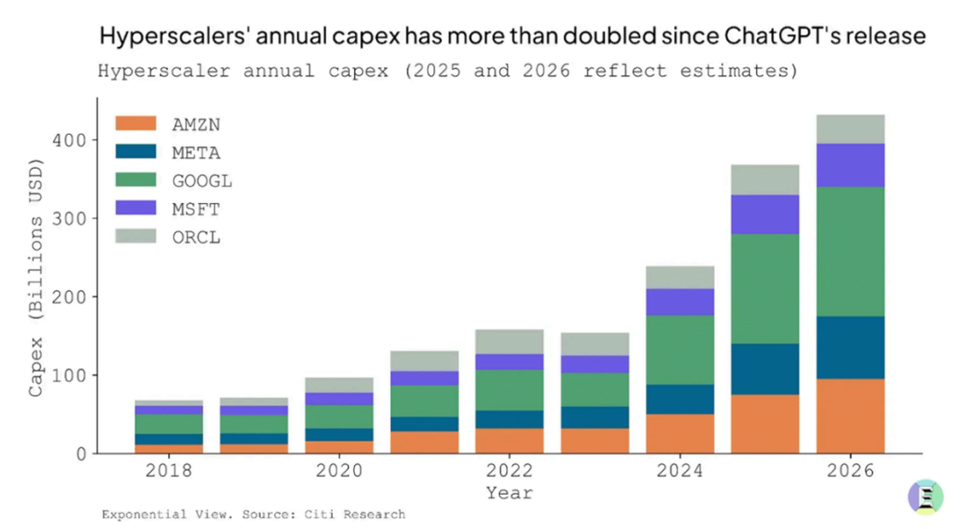 就AI 基础设施而言,其中大部分支出表现为资本支出:服务器、冷却系统、网络设备、钢筋水泥建造的机房,以及维持其运转所需的供电设施等。