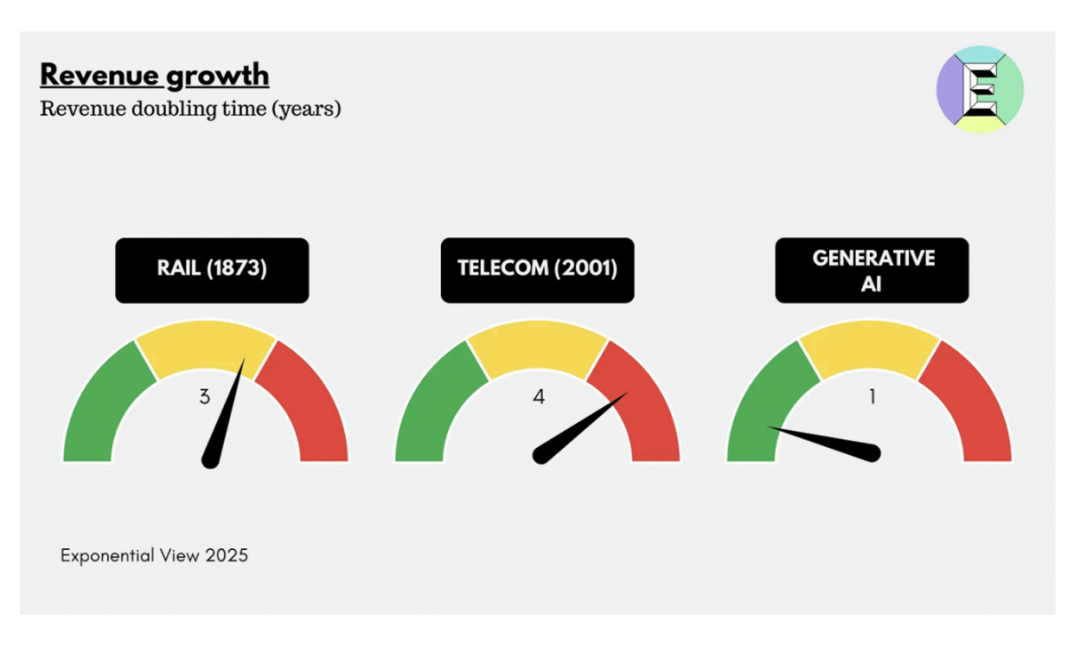 今天的情况要平静得多。纳斯达克指数的市盈率约为32,仅为互联网泡沫时期的一半。更广泛的科技板块估值虽高于历史均值,但远未达到互联网泡沫的地步。和铁路泡沫时期相比,当前估值算高的。但是铁路泡沫以悲剧收场,原因并不在于估值本身有多极端,而在于收入增长停滞。相反,genAI 的收入目前依然在快速攀升。