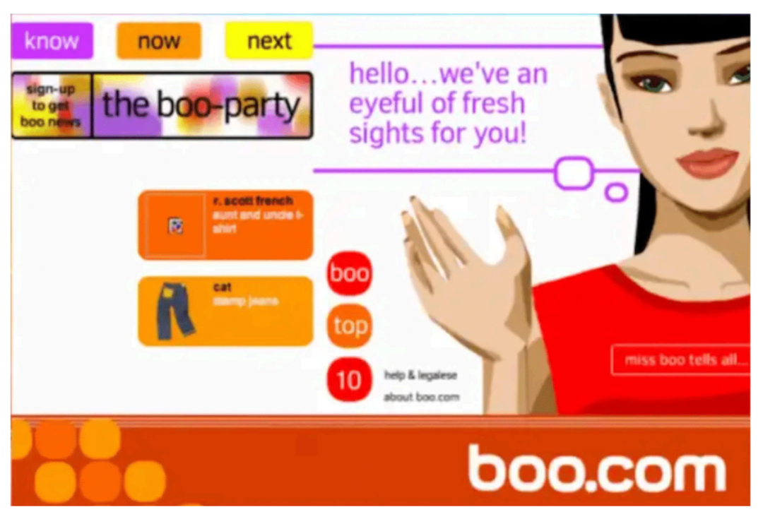 这家公司在上线前就砸下2,500万美元做广告,员工从40人暴涨到400人,并在纽约和欧洲开设了豪华办公室。他们的网站大量使用 JavaScript 和Flash,在拨号上网环境下几乎无法使用,还与 Mac 电脑不兼容且漏洞百出。每四次尝试购买就有一次失败。尽管公司极尽铺张,调查却显示只有13%的互联网用户知道这个品牌。不到18个月,资金耗尽。2000年5月,Boo.com宣告倒闭。