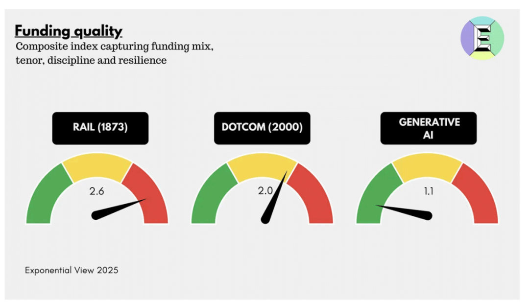在这些案例中,支撑繁荣的资本最终都被证明是易碎的。但脆弱程度各不相同。铁路和电信泡沫最易受信贷紧缩冲击,债务率急剧膨胀;而互联网泡沫下,公司更多是受市场情绪摆布——股价蒸发殆尽。