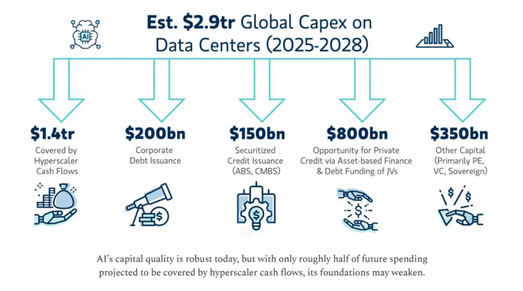 风险正在这里潜伏。摩根士丹利指出,大约有1.5万亿美元的资金缺口需要通过债券市场和资产支持证券来填补。这个数字相当惊人:私募信贷预计贡献8,000亿美元,数据中心资产证券化预计1,500亿美元,另外还有数千亿美元来自设备厂商贷款和供应商融资。光是那1,500亿美元,就几乎会让数据中心证券化市场的规模在一夜之间扩大两倍有余。而并非每个借款人都像微软那样稳健。