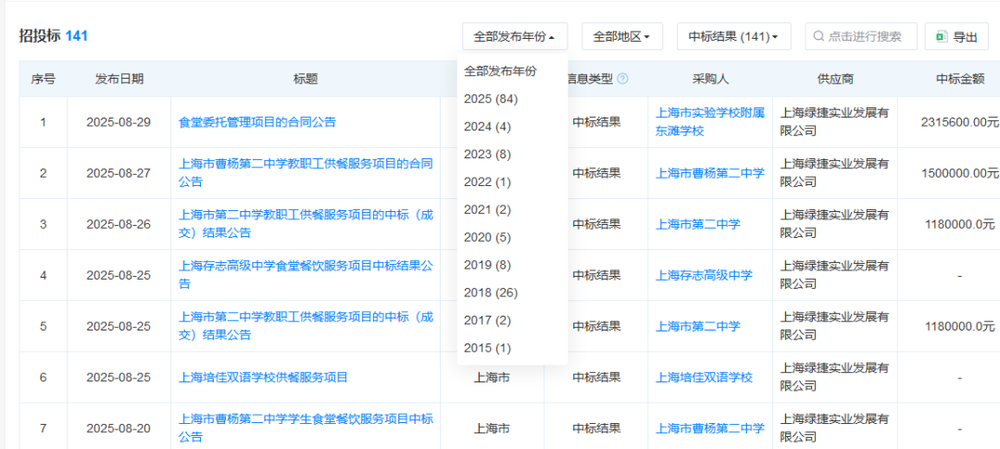 资料显示,上海绿捷成立于2014年,2017年便已服务331所中小学、日供36万份餐食,到2024年更是扩张至覆盖500多所学校及幼儿园,日供餐量突破50万份,占据上海近三成校园配餐份额。2025年8月单月,上海绿捷更是一口气中标27个项目,将上海市第二中学、华东师大附属外国语实验学校等名校纳入服务清单,中标公告里清一色写着“方案详实、预案齐全”,看似无可挑剔。