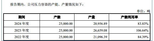 另外,从实际经营情况来看,公司当前产能利用效率已出现明显下滑,扩产计划缺乏充足的市场需求支撑。报告期内,公司压力容器产量呈现“先升后降”的波动趋势:2022年为21096.39吨,2023年增至26659.08吨,2024年却大幅回落至20956.89吨,同比减少5702.19吨;对应产能利用率也同步下滑,2024年在产能未变的情况下,利用率降至83.83%,较2023年下降22.81个百分点。这一数据表明,公司现有产能尚未实现充分饱和,2024年产量与利用率的双降,更反映出压力容器市场需求可能出现阶段性收缩,或公司自身订单获取能力减弱。在此背景下,公司仍计划新增3万吨产能,这不仅令人疑惑,在公司目前产能尚未充分利用的背景以及公司自身降产的情况下,为何还要大举扩产?以及如此多的产能到底是否能被市场消化?