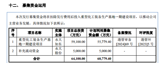 永大股份此次IPO欲募集60779.4万元,分别用于重型化工装备生产基地一期建设项目、补充流动资金项目,具体情况如下: