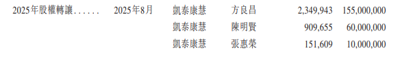然而,就在估值高企且公司即将冲击IPO的关键节点,一则股东股权转让事项引发市场费解。2025年8月,即新元素IPO申报稿(2025年9月被港交所受理)提交前一个月,2025年8月投资方凯泰康慧将其持有的公司股权,分别转让给方良昌、陈明贤、张惠荣三位受让方,转让价格为66元/股。