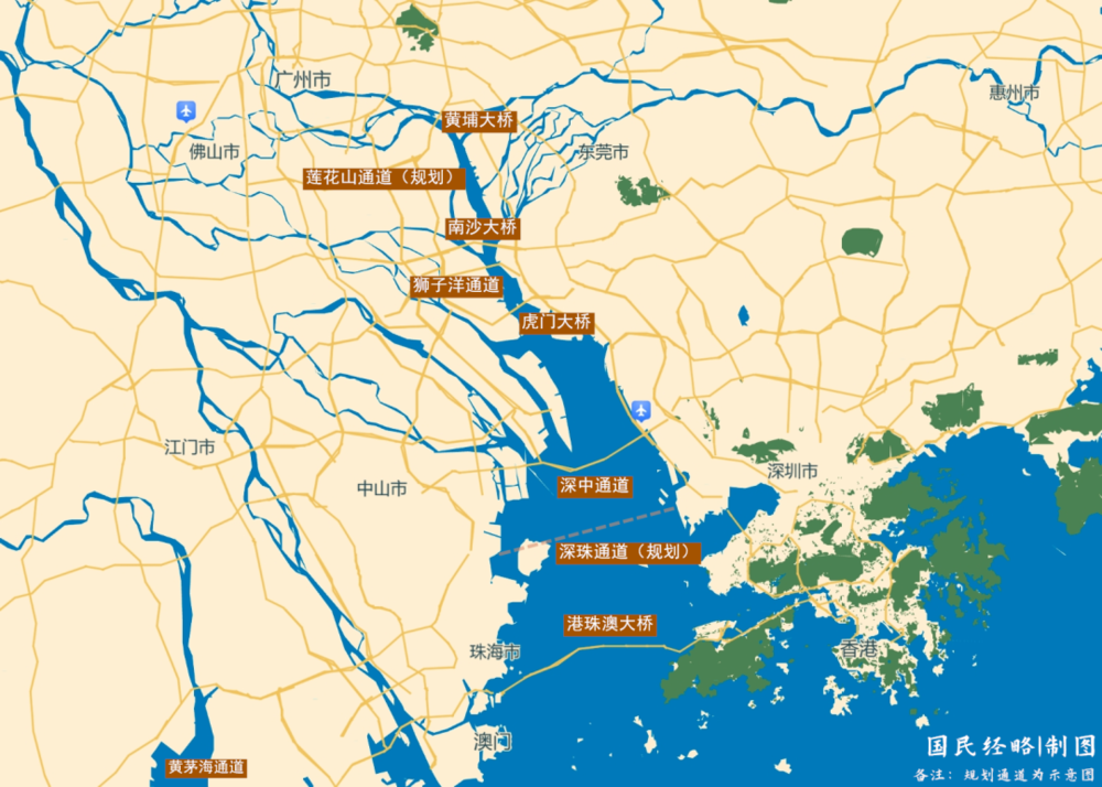 珠江口两岸,已有虎门大桥、南沙大桥、深中通道、港珠澳大桥等多条跨江跨海通道,将大湾区连成一体。