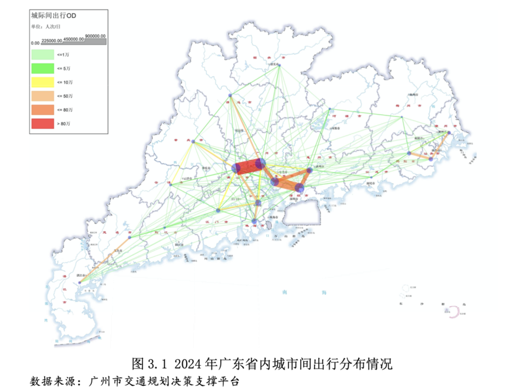 报告显示,2024年,湾区九市间(不含港澳)日均出行721万人次,广州与佛山、深圳与东莞、珠海与中山、广州与东莞最为密集。