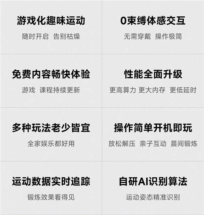 💡 **AI技术赋能零束缚体感交互:** 运动宇宙新款AI体感运动主机,依托数联天下自研C-Life算法大模型,整合运动健康大模型、运动姿态识别与骨骼关键点检测等核心技术。其创新之处在于用户无需佩戴任何外设设备,即可通过电视大屏进行高精度的体感交互和运动数据分析,大幅降低了使用门槛,提升了运动的便捷性和自由度。