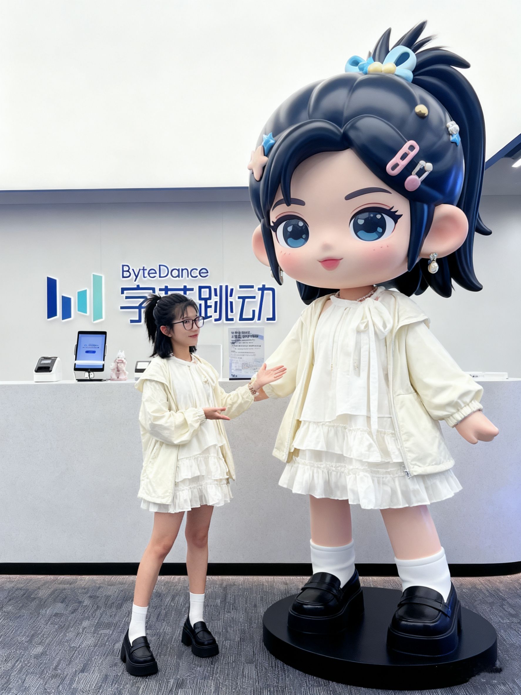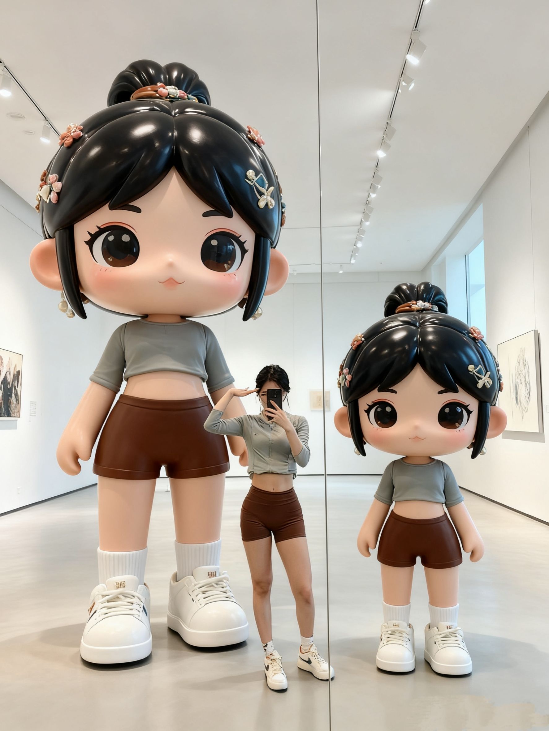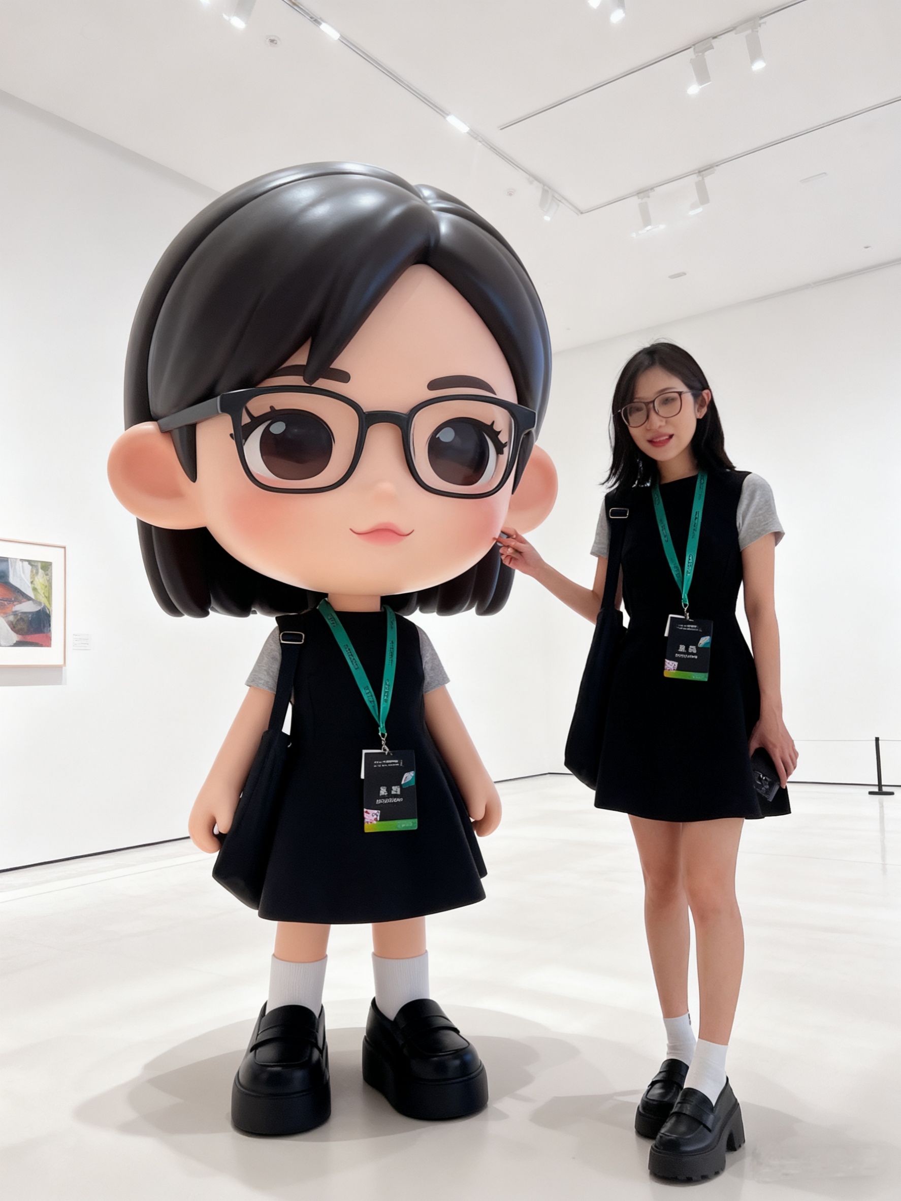 帮我生成图片:帮我生成图片:在明亮简洁的艺术展厅空间,图中主体人物身旁站立着一个同穿搭、配饰、发型、装饰等保持一致,人脸一致,体积比主体人物大好多倍的超大型Q版人偶,主体人物五官不要有变形,整体营造时尚潮流且可爱氛围,强烈的比例反差,面清晰精致,光影融合,突出人物与巨型人偶的互动及同款穿搭。原比例。原比例。