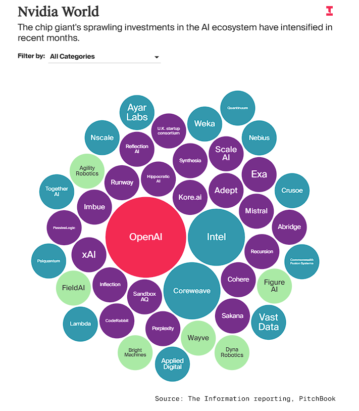 文章通过深入调研和采访多位业内人士,包括英伟达高管和知情人士,展现了这家芯片巨头如何运用其庞大的现金流来塑造整个AI生态系统。报道指出,英伟达的投资策略已经超越了传统的商业合作范畴,开始具备了类似政府调控经济的特征。文章认为,英伟达 (NVDA.US)的投资规模和覆盖范围已经达到了前所未有的程度。从数据中心建设到AI模型开发,从初创公司孵化到大型项目融资,英伟达的触角几乎遍及AI产业的每个角落。这种全方位的参与使得它在AI经济中获得了类似"央行"的地位和影响力。文章特别强调了英伟达疯狂投资背后的驱动因素——对未来技术突破可能绕过其芯片的深层恐惧。这种担忧促使公司采取了更加积极的投资策略,试图通过资本力量来巩固自己在AI生态系统中的核心地位。AI经济的"政府"角色文章开篇提到黄仁勋令人眼花缭乱的投资手笔,比如在过去几个月, 英伟达 (NVDA.US)就承诺投资OpenAI高达1000亿美元,收购了多家初创公司的技术和人才,甚至还向竞争对手英特尔伸出了橄榄枝。这些行为都指向一个核心观点:英伟达正在成为人工智能领域的“事实政府”。