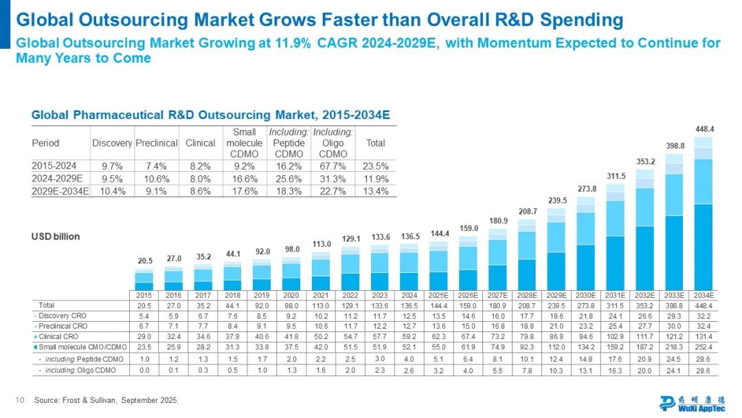 据预测,医药行业外包渗透率将从2024年的50%提升至2034年的65%,市场空间持续扩容。显而易见,药明康德所面临的“研发市场增长+外包渗透率提升”双重机遇,意味着其业务增量将远超医药研发行业的整体增量。