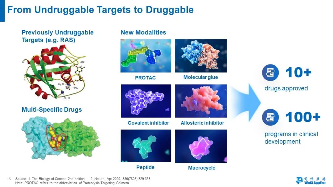 其次,随着新分子技术的推进,更多传统意义上不可成药的靶点将会被攻克,带动更多“增量”领域的开发。目前,超过85%的人类疾病相关蛋白质组被认为是不可成药的,但就在过去几年,已有十多款针对此前不可成药靶点的新药推入市场,超过100个候选药物已处于临床阶段,未来还有无限的可能。
