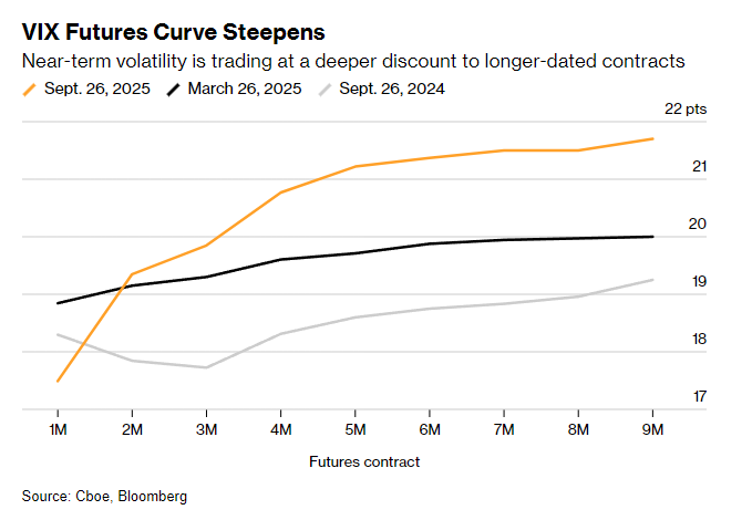 这种现象在短期波动率上尤为显著,标普500指数的交易区间始终收窄。这使得短期期权的隐含波动率维持在低位,进而压低VIX现货指数及近月期货价格。
