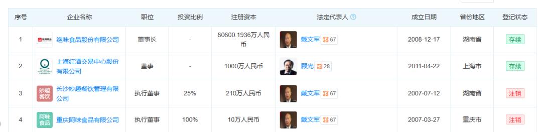 天眼查数据显示,目前,戴文军担任绝味食品股份有限公司以及上海红酒交易中心股份有限公司2家存续企业的高管。