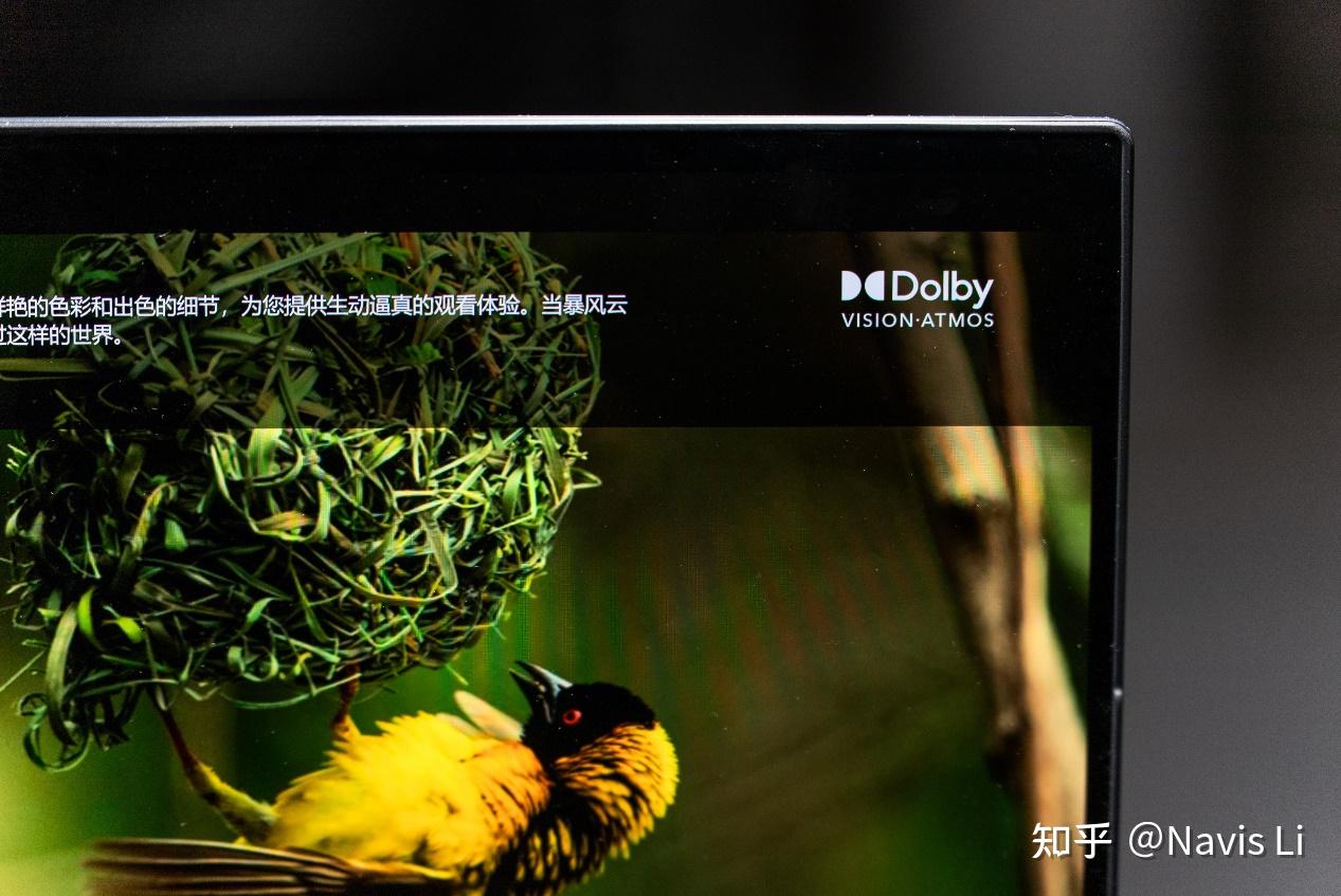 同时,这块屏幕也支持杜比视界,它的音响也经过了杜比全景声的认证,所以当你找到一个双杜比的内容,都可以看到 Dolby Vision + Dolby Atoms 两个图标同时点亮,这时候你看到的画面和听到的声音都完全不一样了。