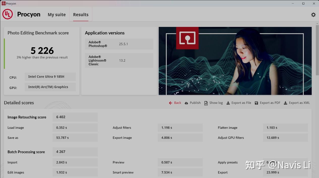 而在 Ps 和 Lr 的图片编辑部分它也有 5226 分,英特尔的 Ultra 9 185H 配合高频内存对于这部分的应用来说,确实有很大的帮助。