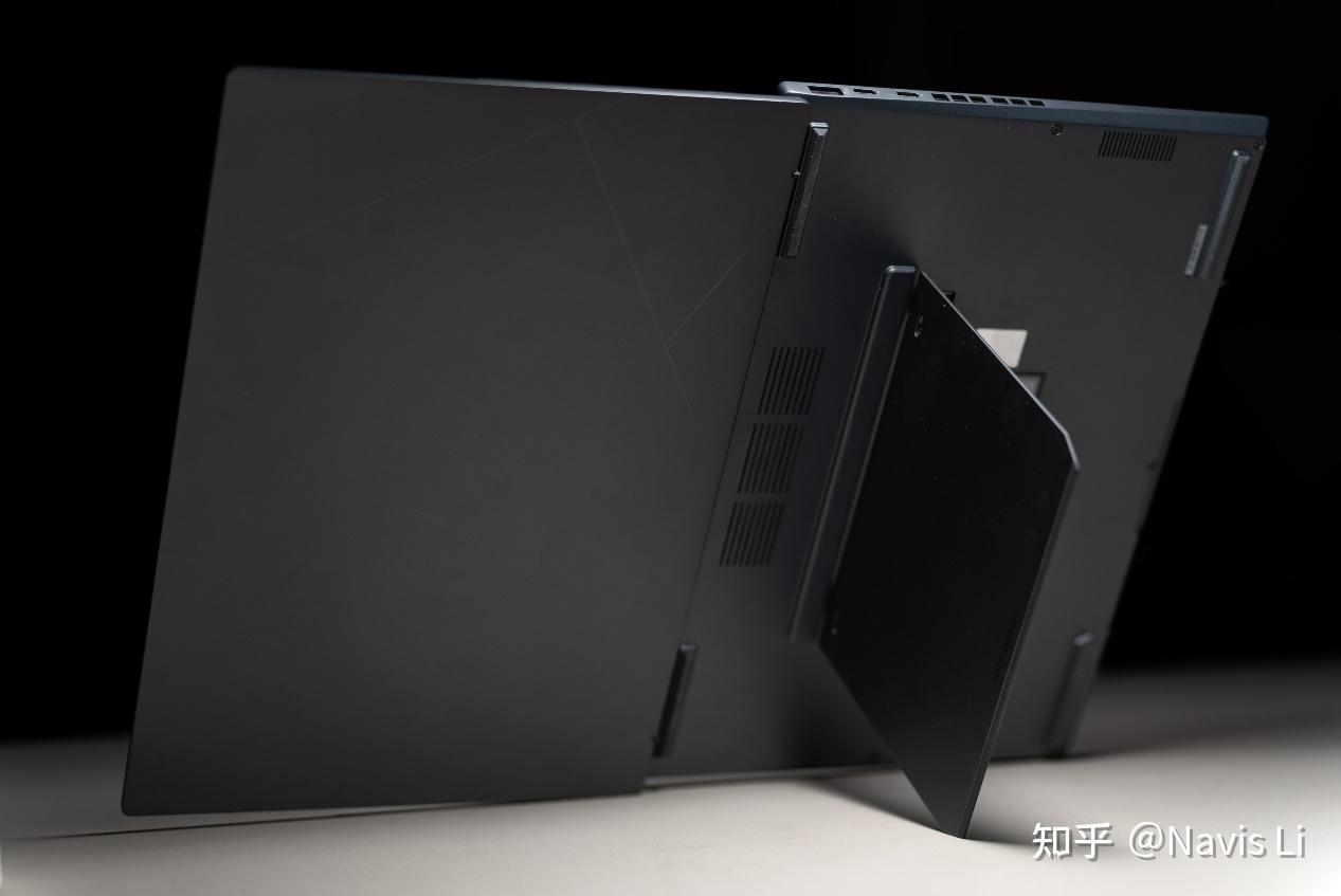 如果你把机身背面的支架开到 90°,那么它下方的一个切角就能让灵耀14 双屏横着立起来。