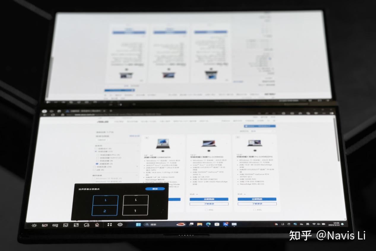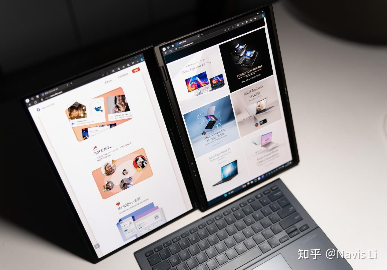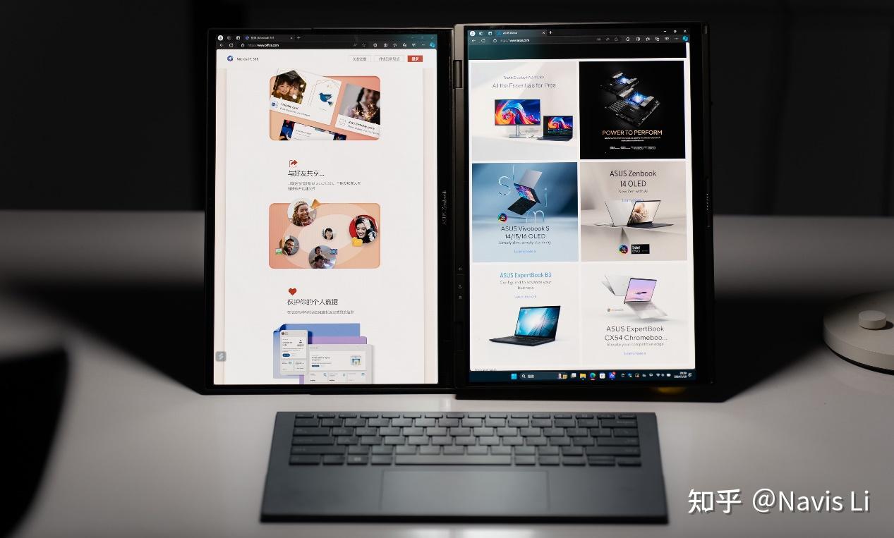 而到了今年的灵耀 14 双屏,我觉得双屏笔记本算是成了完全体,进入了新的时代,双屏同尺寸同规格,笔记本自带支架可上下可左右,极大的提升了你的使用效率,而且形态就和普通笔记本没有区别。