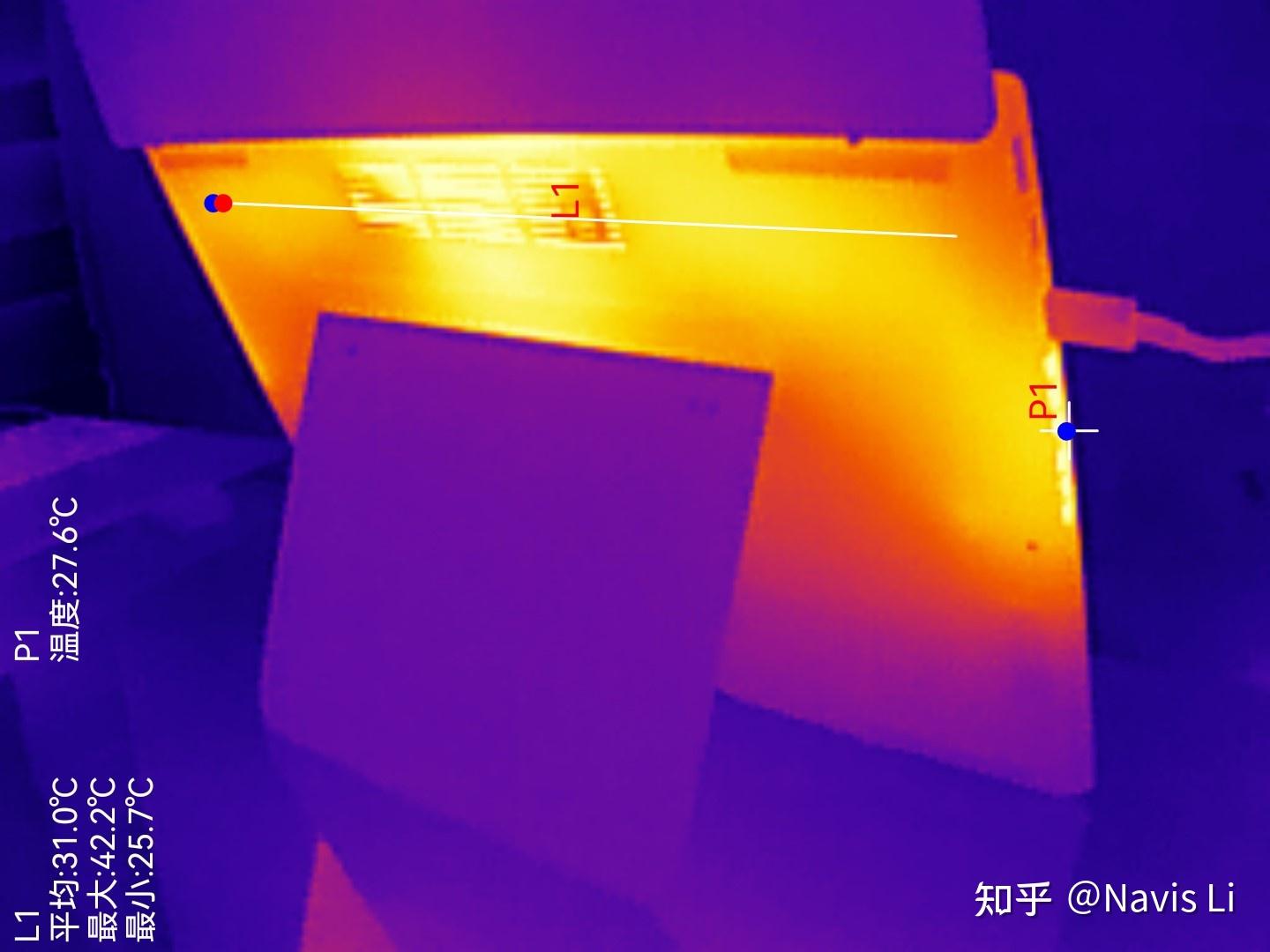如果你愿意把键盘拆下来,使用竖向的双屏模式,那么虽然功耗还是稳定 35W, 但温度可以下降 3°C 左右,机身的温度也会稍微下降一些,我觉得大可不必担心机身下方的屏幕会因为温度而出现问题。