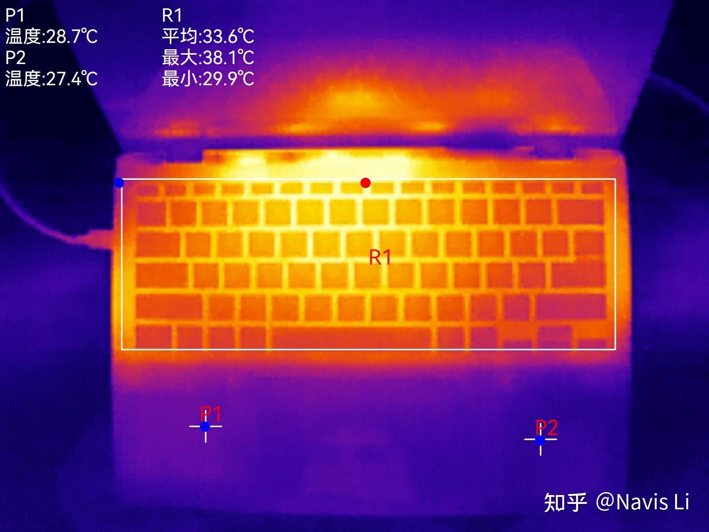 灵耀14 双屏的键盘因为并不是直接在机身上的,所以隔了一层之后温度并不高,最大也只有 38°C, 平均只有 33.6°C, 掌托就更低了,基本就等于室温。
