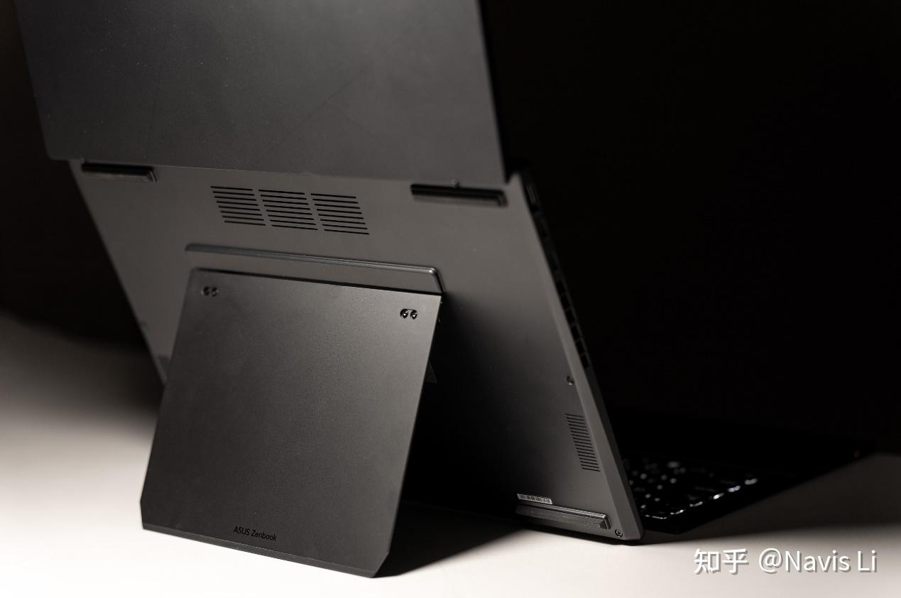 灵耀14 双屏的机身背面自带一个支架,打开支架之后你就能让机身被稳稳的立起来: