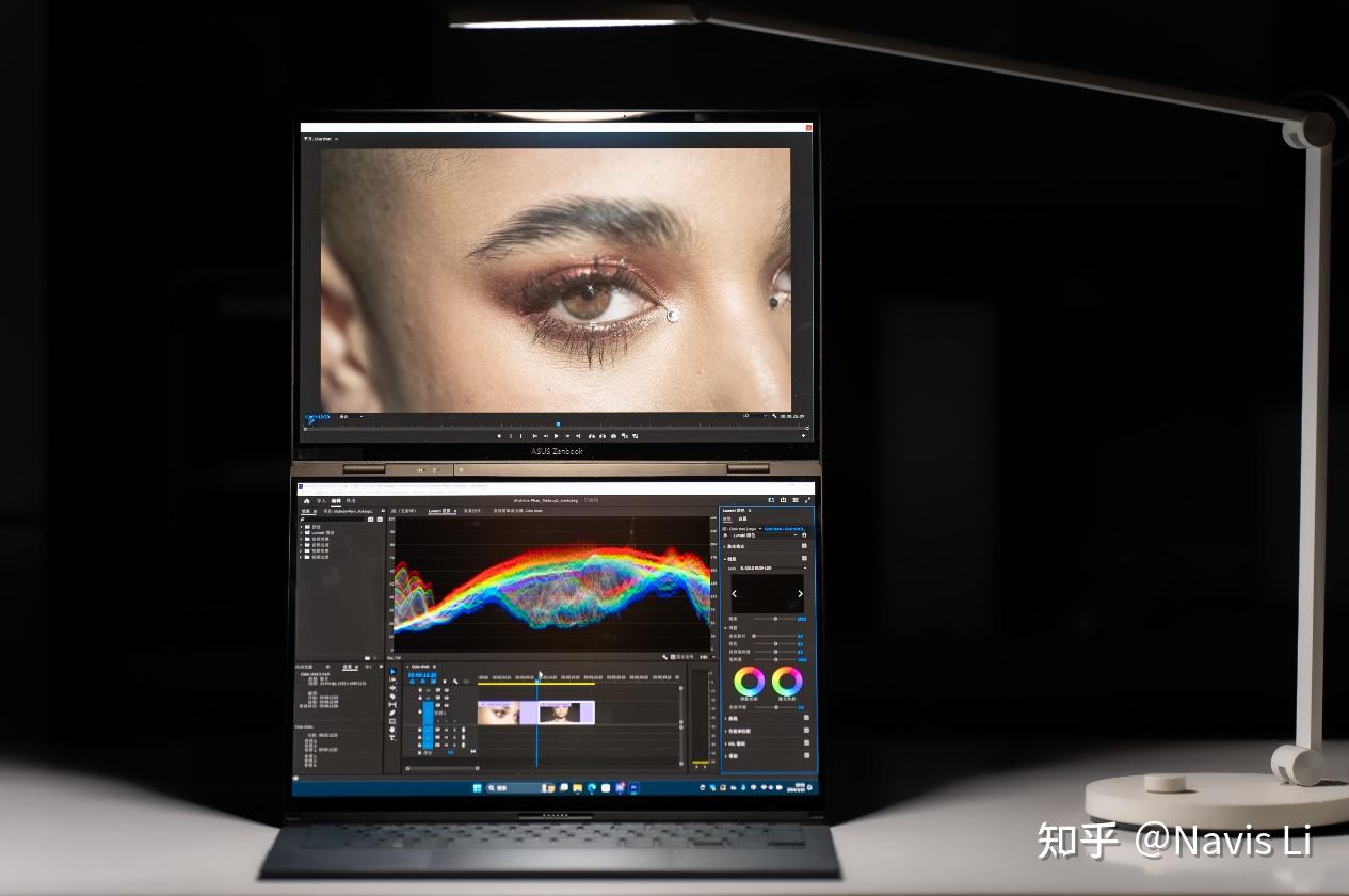 上边的 14 英寸大屏幕独享整个时间线预览窗口,下边的 14 英寸大屏幕可以放置示波器,调色盘,特效库,还有事件线剪辑,效率大大提高。
