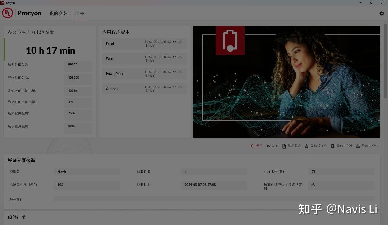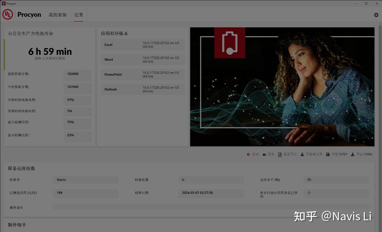 灵耀14 双屏的电池容量是 75Wh, 支持 USB-C 供电和快充,我们还是用 Procyon 模拟 Office 场景的测试来计算续航时间: