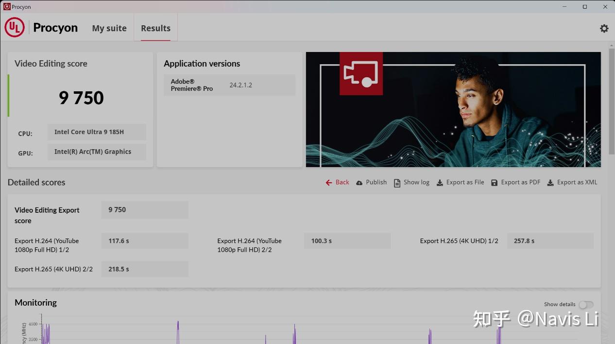 而在 Procyon 的 Pr 视频编辑输出测试里它也有接近 10000 分的成绩,和很多传统的配上了独立显卡的笔记本电脑也没什么区别。