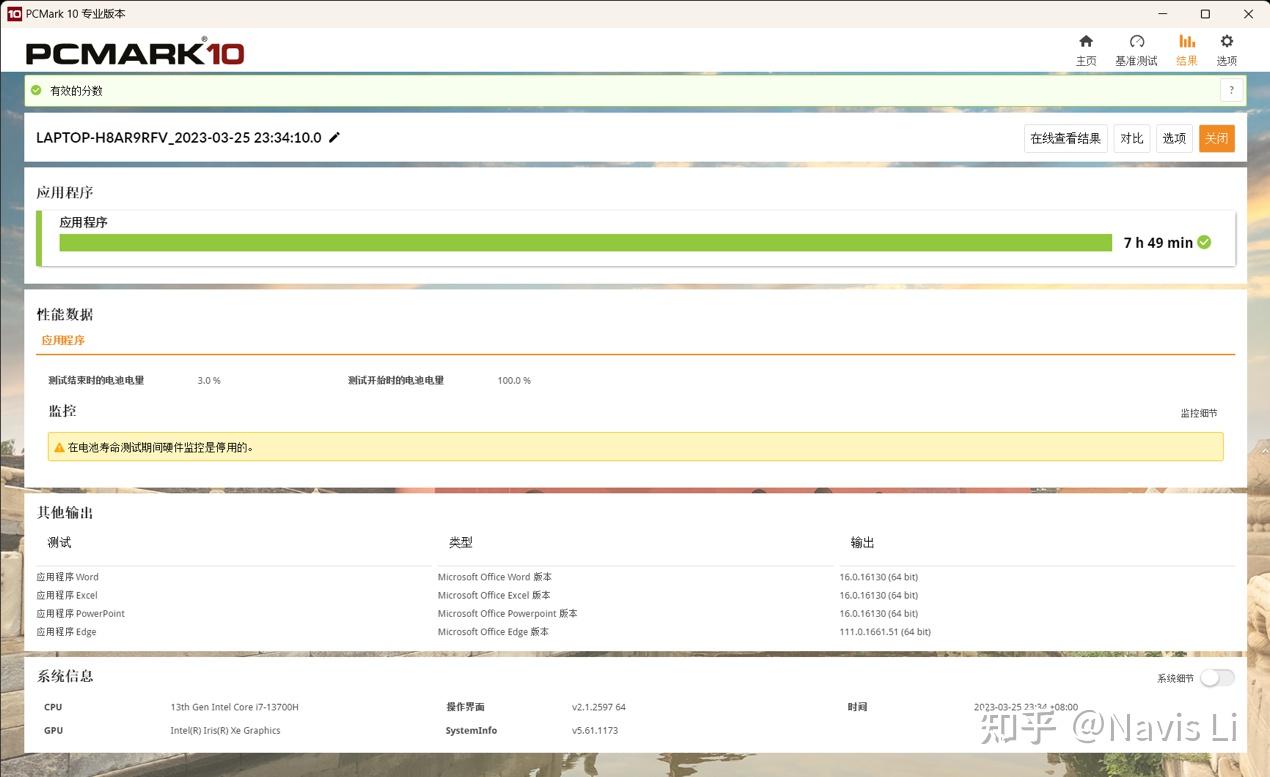 在续航方面,之前测试星Book Pro 14的 i7-13700H版,PCMARK 应用程序测试可以做到接近7小时49分续航,理论上外出半天或是开一个很长的会问题都不大,有Evo平台认证的i5-1340P则会更久。
