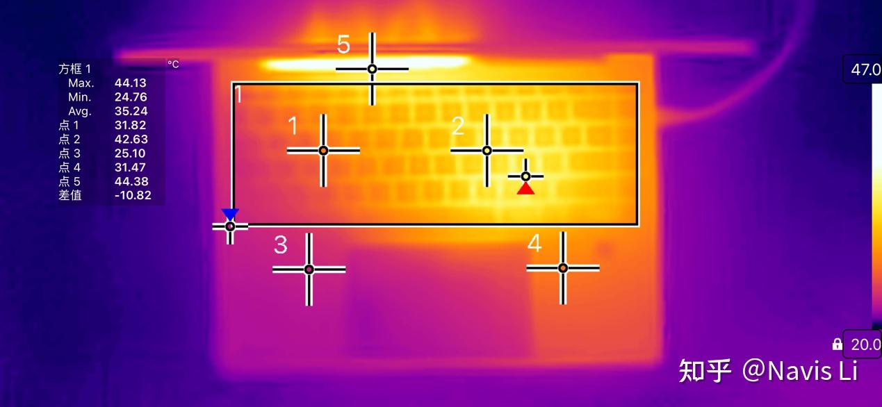 实测20分钟FPU压力测试下,功耗可稳定在45W。从热成像可以看到键盘双风扇正上方(点1)部分温度不高,右手(点2)区域为42.6°C,热量主要集中在CPU上方区域为44°C。这么来看,键盘核心区域温度控制相对一般了。
