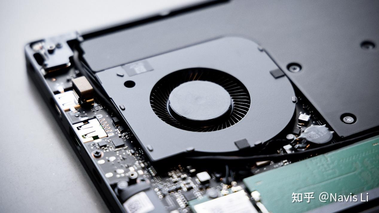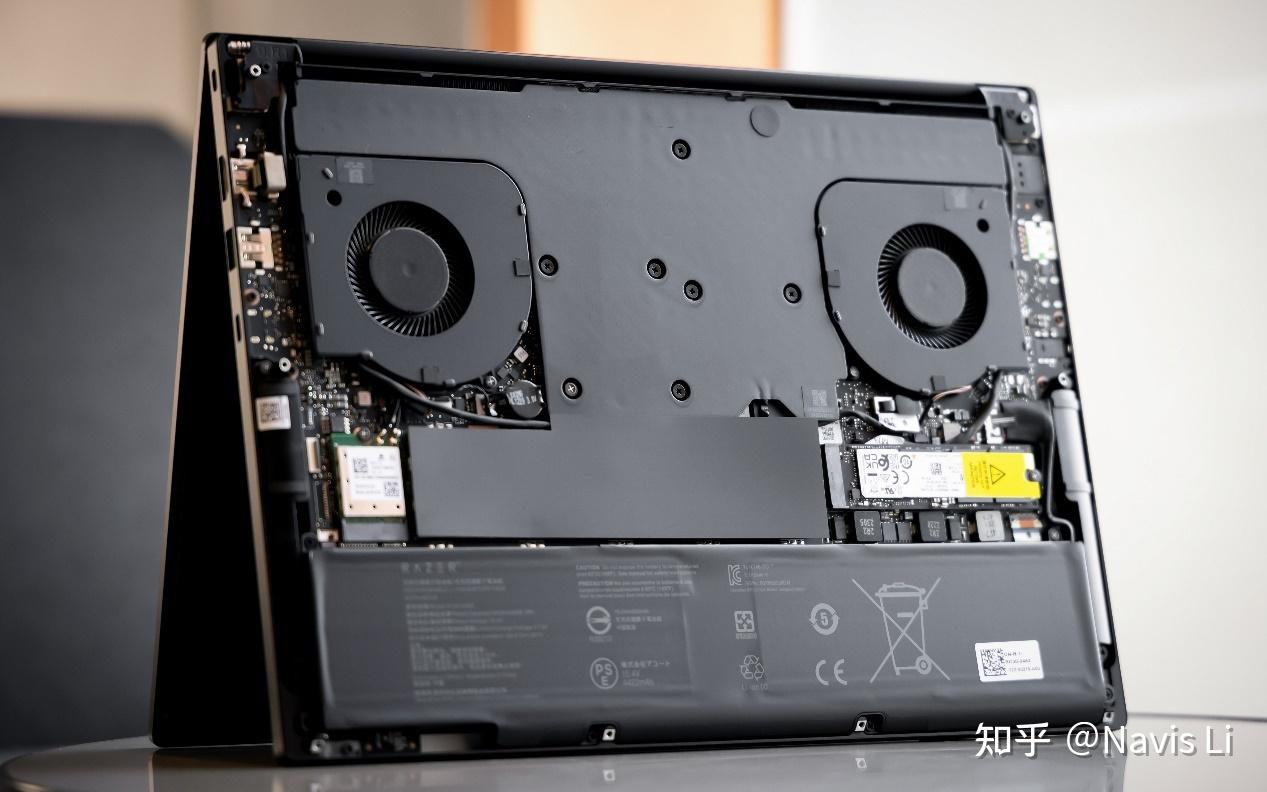 灵刃14 的内部也非常简洁,大面积的真空腔均热板几乎将整个主板覆盖,看上去极其扎实且规整,简直是强迫症福音,下方电池为也要比上一代更大,达到68.1Wh。