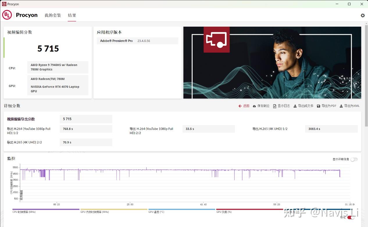 再来看Procyon 的视频编辑和导出能力,5715 的成绩相比,可以看到导出H.264和265 的速度还是比较快的,而在照片编辑和批处理方面,对于140W 的锐龙9+4070来说,即便重负载也完全不用担心,完全可以够胜任绝大部分使用场景。