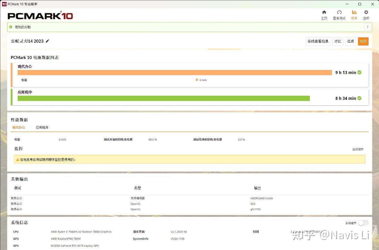 将屏幕亮度调整为115尼特后,实测PCMARK10 现代办公可以做到8H34min,现代办公更是可以达到9小时,这还是在混合模式下测试的表现,可以说这代灵刃14 的续航非常出色了,已经赶上了大部分轻薄商务本。