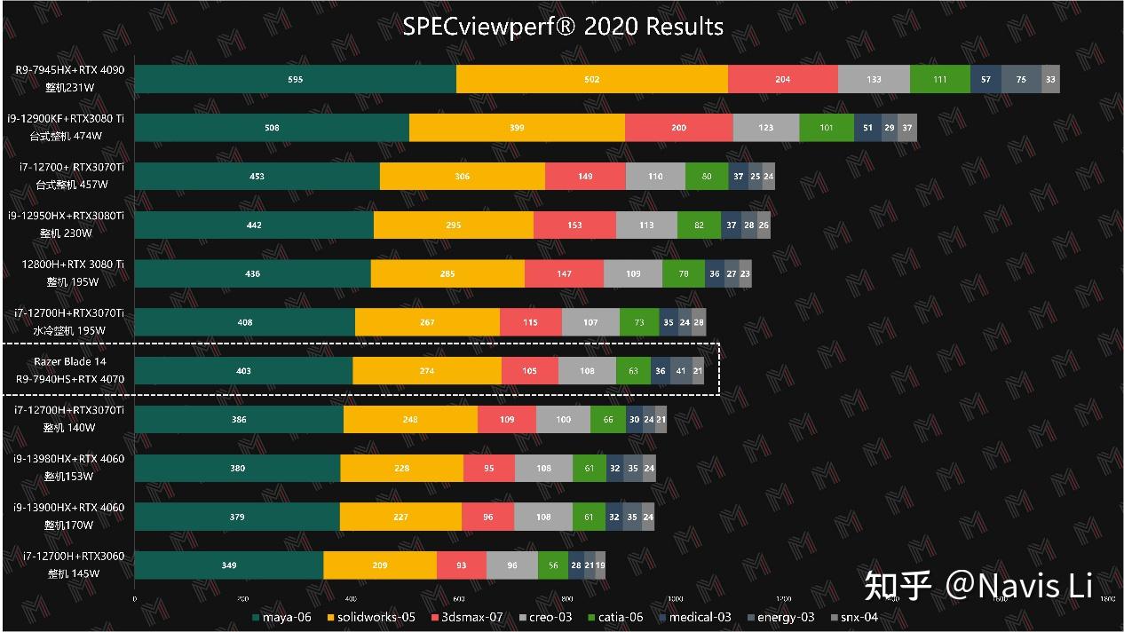 先来看重负的 SPECviewperf 工程类应用测试,首先是帧率比较流畅的有maya-06 图集,可以做到403FPS,solidworks-05 图集为274FPS,像3dsmax-07、creo-03 图集都能做到很流畅的水平,整体表现要优于上一代i7-12700H+RTX3070Ti 百分之10左右。