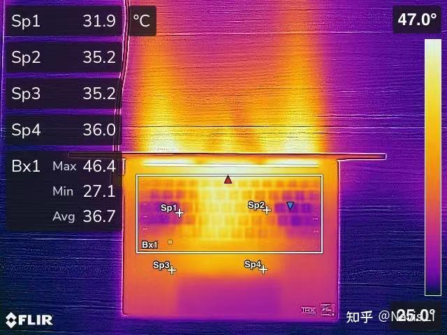 当机内温稳定后,可以看到键盘核心区域平均温仅有36.7°C,最高温也不算高且位于功能键上方,并不会影响操作。左手(点1)正位于风扇上方,仅有32°C,右手区域为35°C,都还是比较不错的,键盘表面温度很直观的反应出灵刃14 的散热表现很出色。