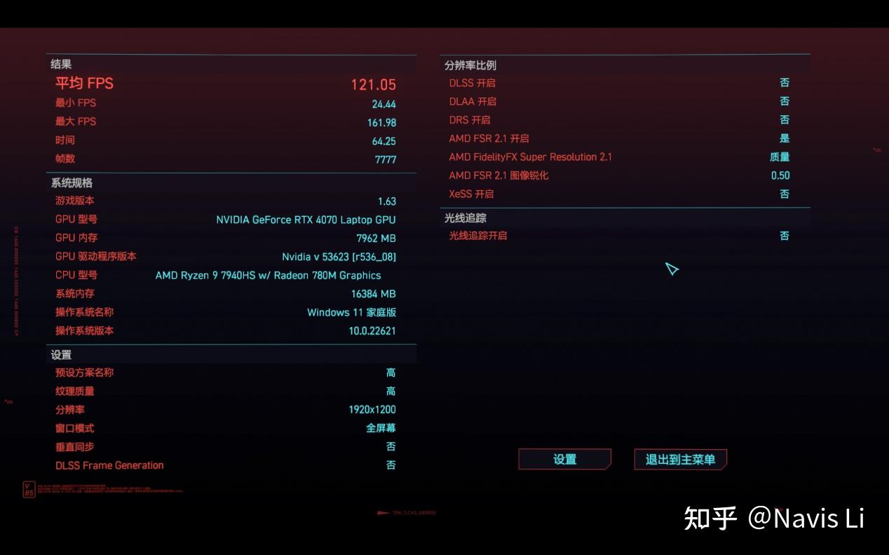 最后是赛博朋克 2077,在FHD 高画质下可以做到121 FPS,QHD 则为83,开启DLSS质量后为103FPS,表现还算可以。